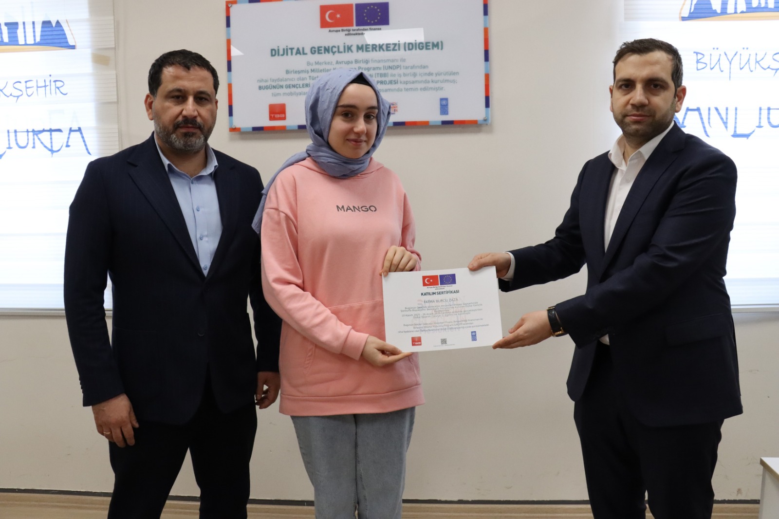 Esentepe Gençlik Merkezinde Dijital Tasarım Eğitimi programına katılarak başarı sağlayan 15 öğrenciye sertifikaları Şanlıurfa Büyükşehir Belediyesi Genel Sekreter Yardımcısı Emrah Karaca, Gençlik ve Spor Hizmetleri Daire Başkanı Mehmet Küçük ile Gençlik Hizmetleri Şube Müdürü Mehmet Fatih Gürez tarafından verildi.